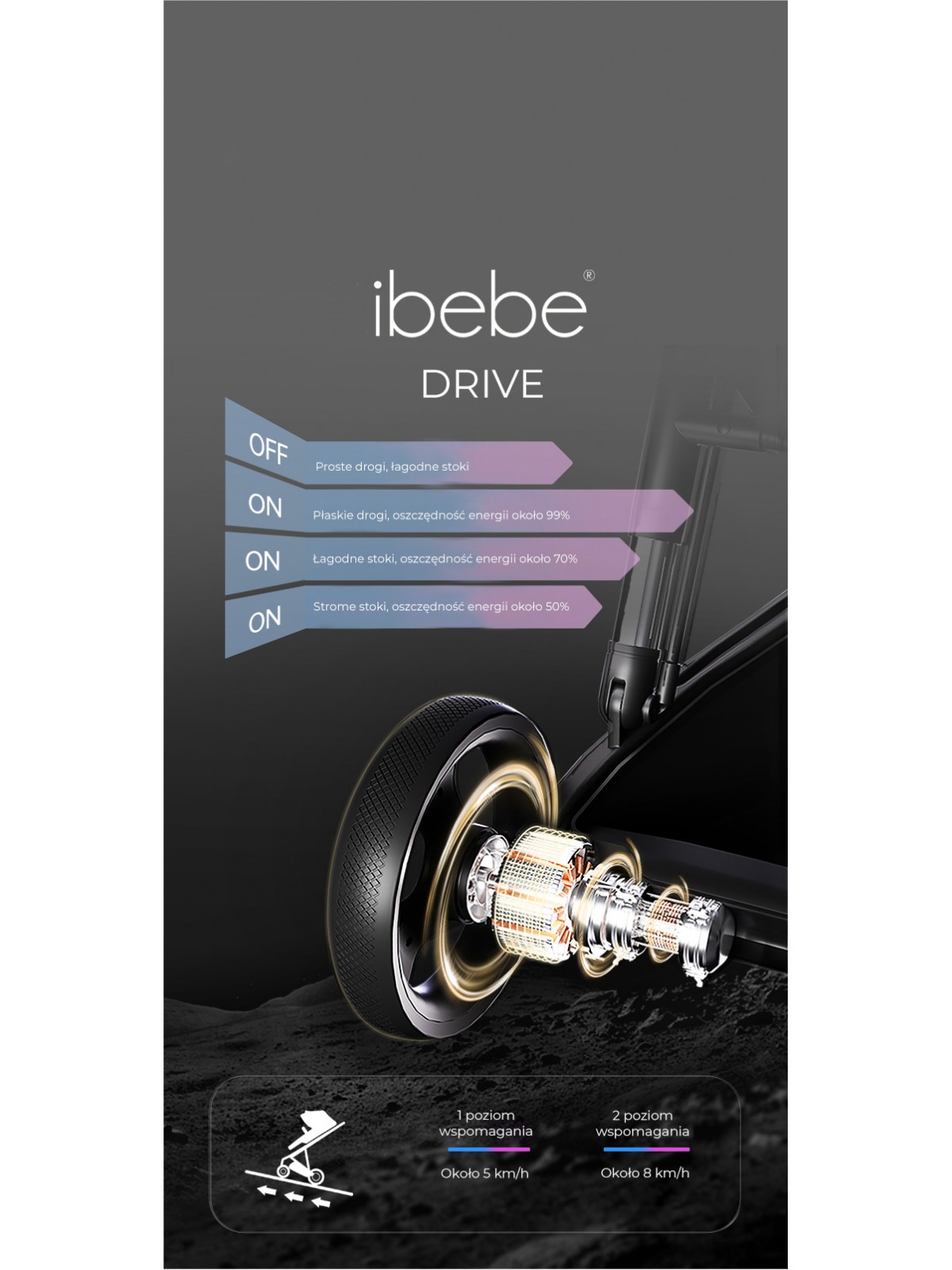 Posiada silnik elektroniczny, co umożliwia wspomaganie jazdy. Rodzice mogą kontrolować prędkość i kierunek za pomocą wbudowanych sterowników. Elektroniczne wspomaganie ułatwia poruszanie się na większe odległości i po trudniejszym terenie, co może być szczególnie przydatne w przypadku długich spacerów czy wizyt w miejscach o zróżnicowanym ukształtowaniu.