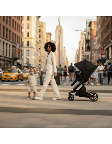 Wózek wyposażony jest w silnik elektroniczny, który wspomaga prowadzenie, umożliwiając rodzicom kontrolę prędkości i kierunku za pomocą wbudowanych sterowników. To ułatwia poruszanie się na większe odległości i trudnym terenie, idealne na długie spacery czy wizyty w miejscach o zróżnicowanym ukształtowaniu.